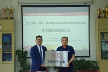 程淑娟代表学院向曾斌博士颁发特聘教授证书,朱茂向浙江天册(深圳)律师事务所实践教育基地授牌。